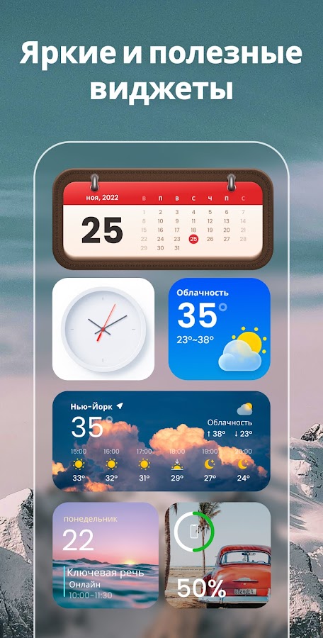 Вы можете добавлять виджеты для украшения экрана своего телефона и держать информацию под рукой — погодные условия, уровень заряда батареи, состояние Bluetooth или предстоящие события календаря. Доступны различные размеры виджетов. Вы также можете свободно настроить стиль, цвет, шрифт и другие элементы значка приложения по своему вкусу.