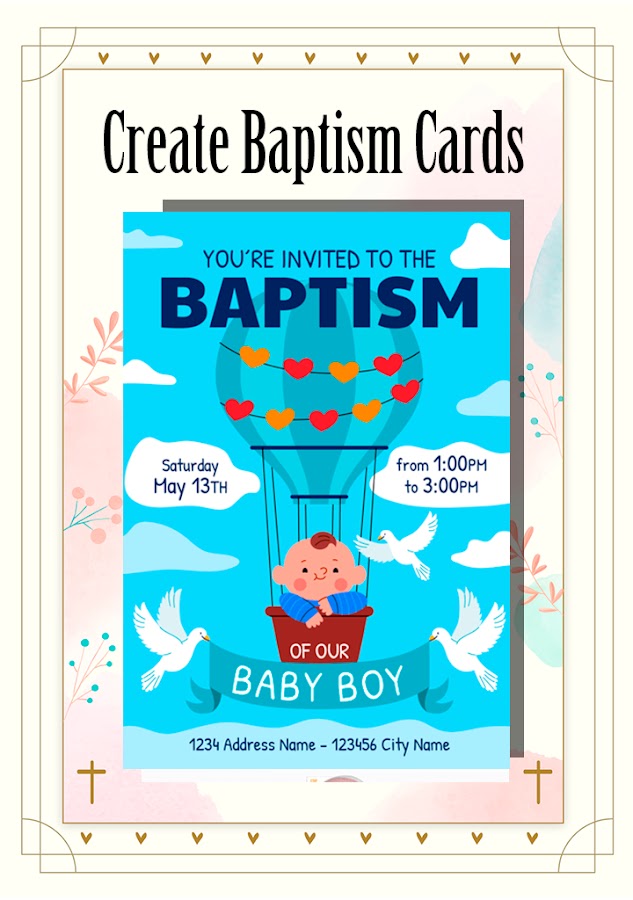 Простые в использовании шаблоны: выберите из разнообразной коллекции профессионально разработанных шаблонов, разработанных специально для приглашений на первое причастие и крещение. Каждый шаблон отражает священность события и суть духовного пути вашего ребенка.