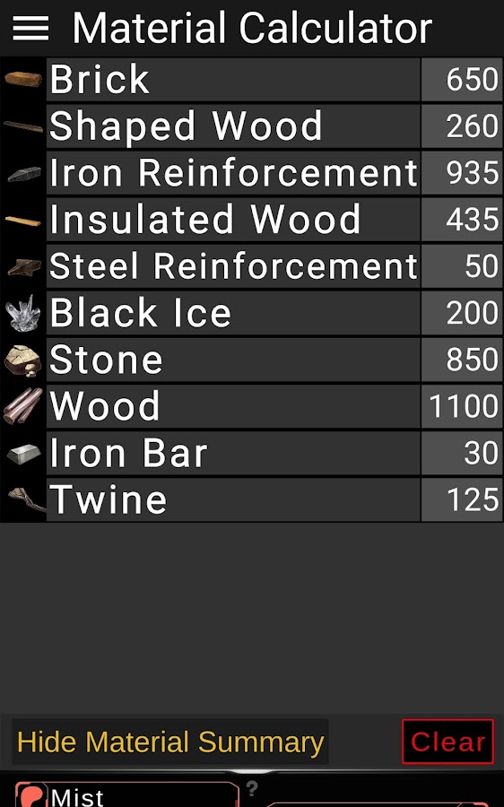 ★ Калькулятор материалов: добавьте любое количество предметов или зданий и установите необходимое количество, и приложение сообщит вам общее количество необходимых материалов.