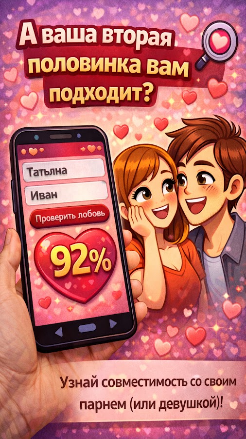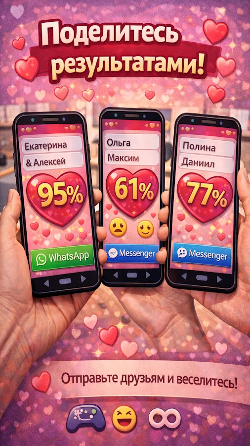 Compatibility Love Tester это развлекательное приложение которое позволяет проверить любовную совместимость между двумя людьми всего за несколько секунд ❤️