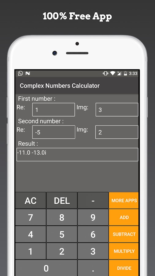 Это бесплатный математический калькулятор для комплексных чисел, который может складывать, вычитать, умножать и делить комплексные числа.