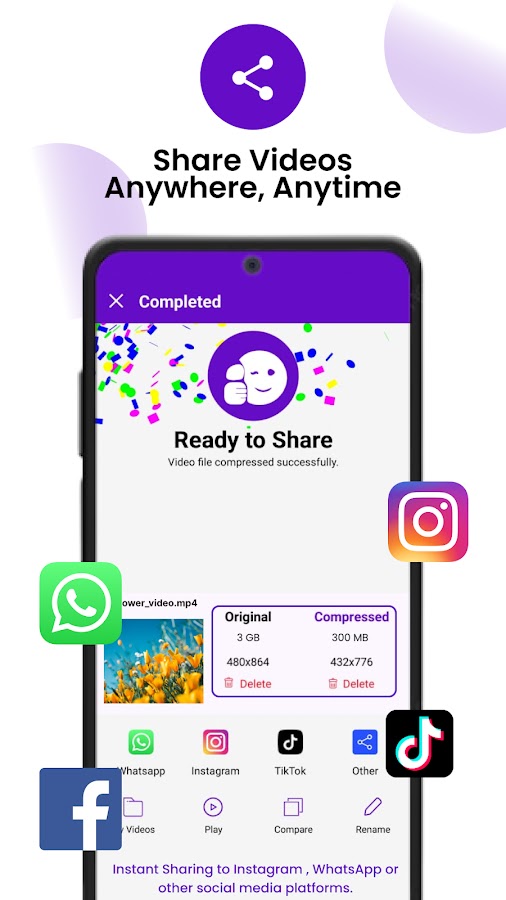 После того, как ваши видео будут сжаты или отредактированы, вы можете просматривать их в мини или полноэкранном режиме. В качестве альтернативы сравните его с исходным изображением или с обрезанной или обрезанной версией. Легко просматривать сохраненные видео в отдельном разделе. Затем легко делитесь ими в Instagram, Facebook, Whatsapp или где угодно одним касанием.