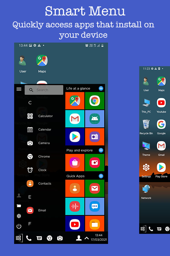 Получите компьютер в стиле настольного ПК Win 10 Launcher на своем Android и сделайте свой телефон Android похожим на пользовательский интерфейс настольного компьютера Metro, как Win 10 PC на вашем Android.