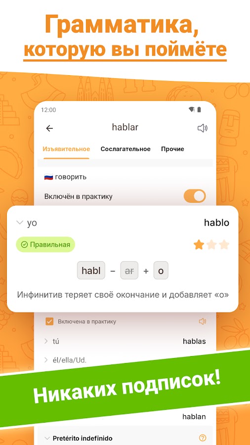 ConjuGato подойдет для изучения и европейского, и латиноамериканского испанского — включите или выключите “vosotros” в настройках чтобы получить нужный диалект.