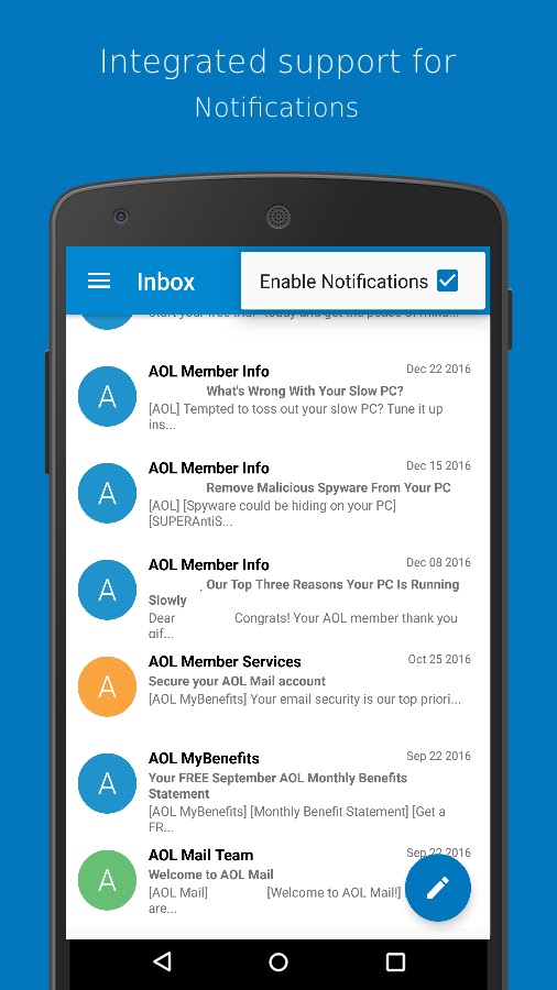 Нет необходимости подписывать каждый раз, когда вы хотите, чтобы проверить входящие сообщения электронной почты, с клиентом для AOL Mail вы всегда будете на связи и готовы читать новое сообщение электронной почты также поблагодарить встроенную систему уведомлений, которая никогда не заставит вас пропустить ни одного сообщения.