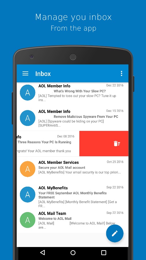 Этот почтовый клиент полностью слился с серверами AOL Mail, так что управление по электронной почте через это приложение будет также управлять электронной почтой на сайте AOL, и это также самое легкое, что вы можете найти там, с менее чем 2mb вы сможете делать все это и многое другое …