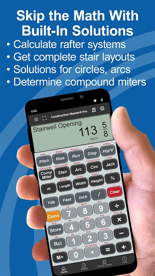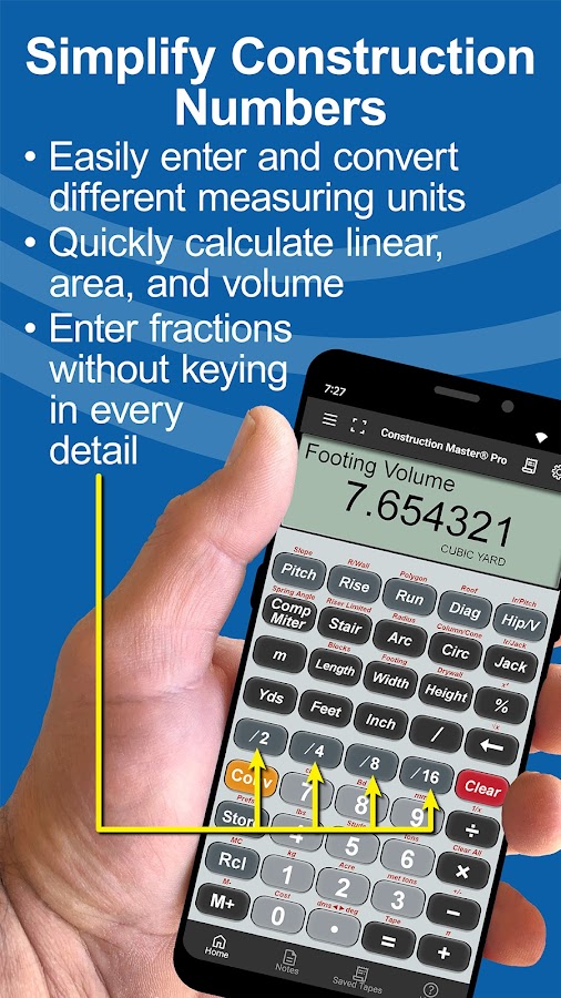 Оптимизируйте эффективность всех своих проектов с помощью Construction Master Pro, строительного калькулятора с указанием долей футов и дюймов.