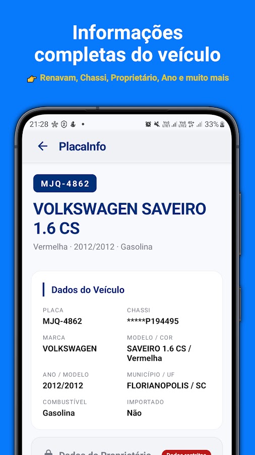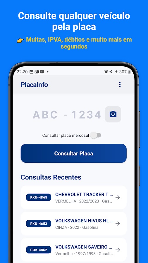 Загрузите PlacaInfo прямо сейчас и упростите управление штрафами и задолженностями за транспортные средства, и всегда знайте информацию о своем автомобиле, используя только номерной знак. ;)