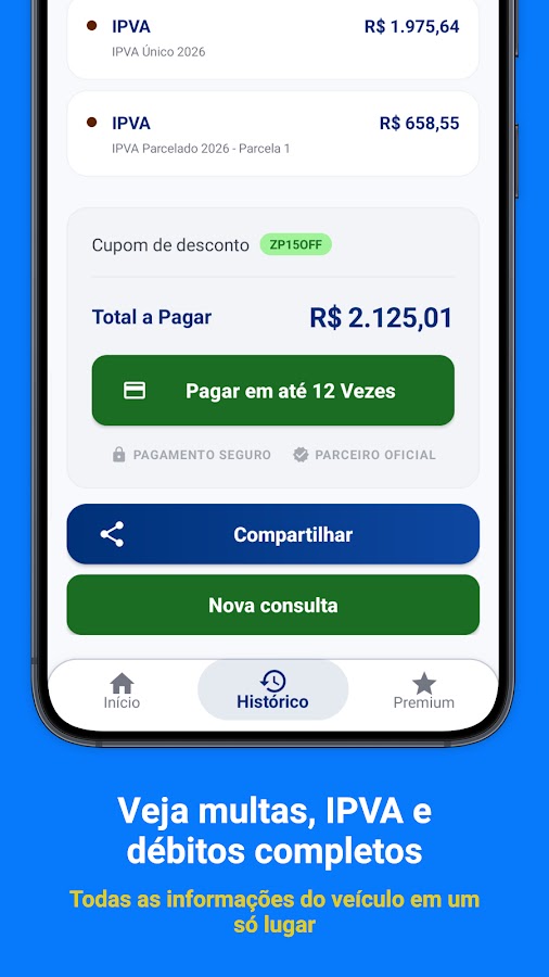 — Проверить сумму и оплатить просроченный налог IPVA для вашего автомобиля, грузовика или мотоцикла;