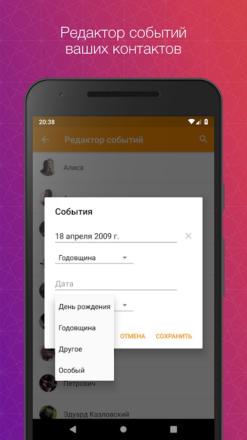 Это приложение будет напоминать вам о днях рождения и других событий ваших контактов.