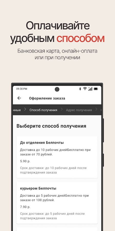 • оплачивайте покупки любым удобным способом, отслеживайте статус заказа и сроки доставки;