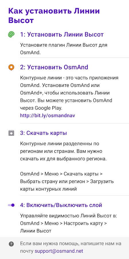 Линии Высот — это плагин контурных линий и рельефа, который требует установки приложения OsmAnd.