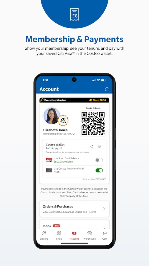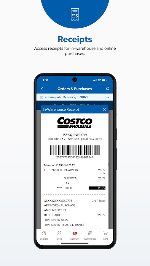 • Новый! Ваша членская карта теперь доступна в приложении Costco. Войдите на склад и начните оформление заказа в реестре, используя цифровую карту участника на своем телефоне.