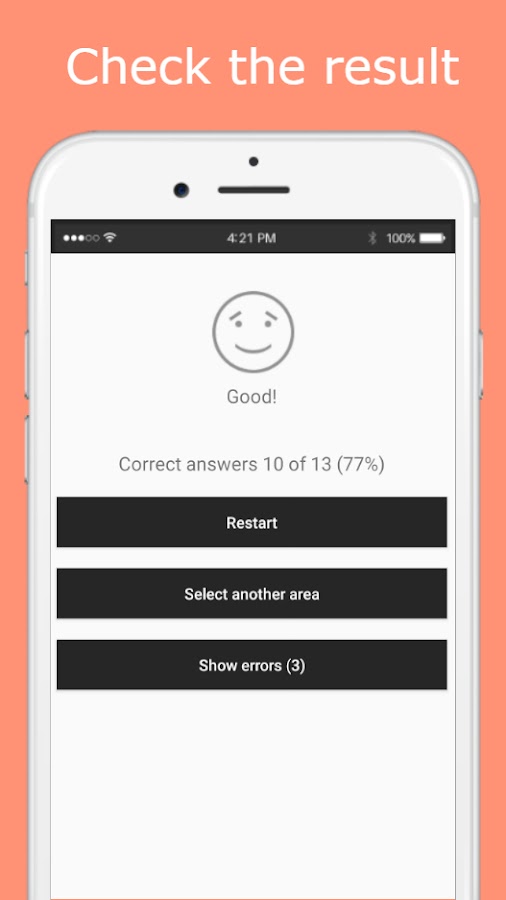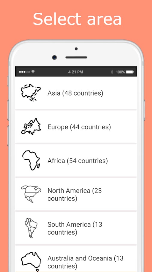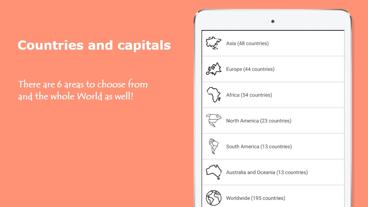 Ключевое особенности приложения является то, что результат прохождения обучающей викторины по каждой сохраняется, Ваша цель — запомнить столицы всех стран сначала в каждой из шести областей, а после, и во всем Мире.