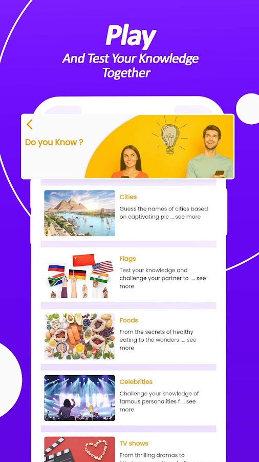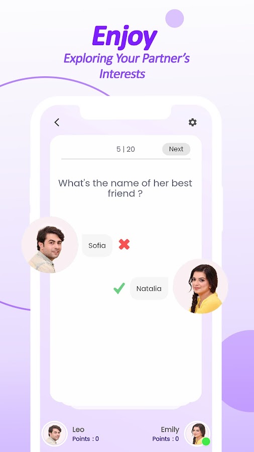 Кроме того, наши игры для пар предлагают викторину об отношениях для пар, которые уже давно вместе. Это помогает парам понять сильные и слабые стороны в их отношениях, а также предлагает, как улучшить общение между парами. Одной из самых популярных функций нашего приложения для пар является викторина для новых любовников. Эти викторины предназначены для того, чтобы помочь парам понять симпатии, антипатии и характеры друг друга в целом. Это отличный способ правильно начать новые отношения или вновь зажечь искру в долгосрочном браке.