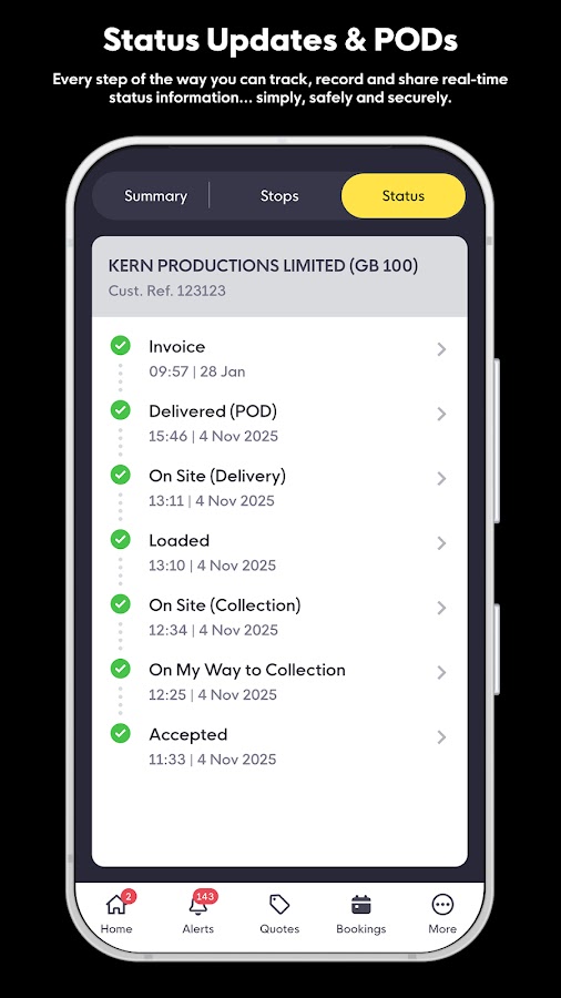 Обновите бронирование в приложении Courier Exchange Mobile, используя функцию обновления статуса в 2 касания. При этом отправляется отметка даты и времени участнику, который заключил с вами договор на выполнение четырех основных этапов доставки; На месте — самовывоз, загружен, на месте — доставка, POD.