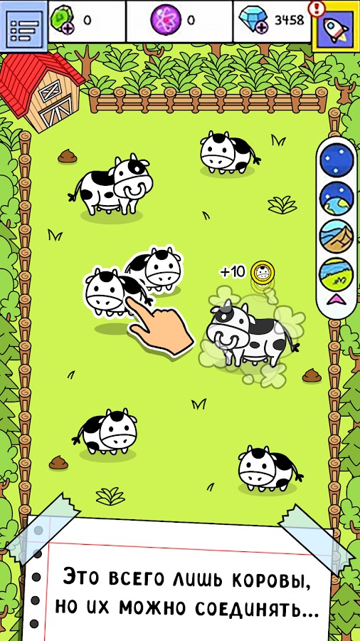 • Перемещайте коров одну к другой, чтобы в результате они включались в эволюцию и производили тварей, которые приносят еще больше денег.