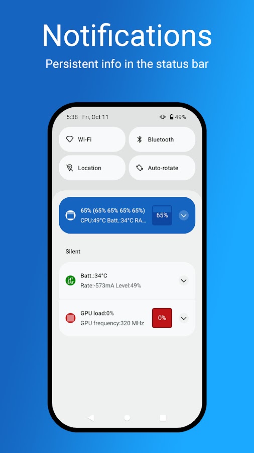 С помощью этого приложения для мониторинга процессора/видеокарты/батареи и уведомлений вы можете получить все эти данные в виде постоянного уведомления, доступного одним свайпом.