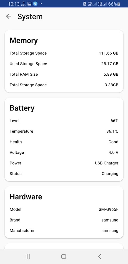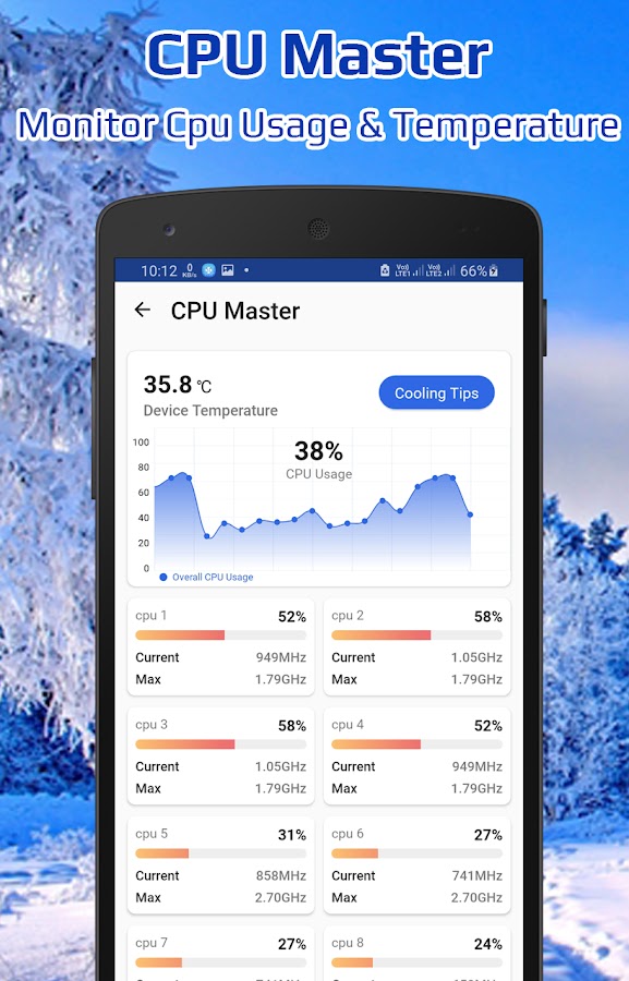CPU Monitor может отслеживать использование и частоту устройства в режиме реального времени. Он может контролировать температуру аккумулятора (приблизительную температуру телефона или процессора) и давать советы по охлаждению телефона. CPU Monitor также обеспечивает мониторинг батареи и подробную системную информацию, например, объем памяти телефона и использование оперативной памяти.