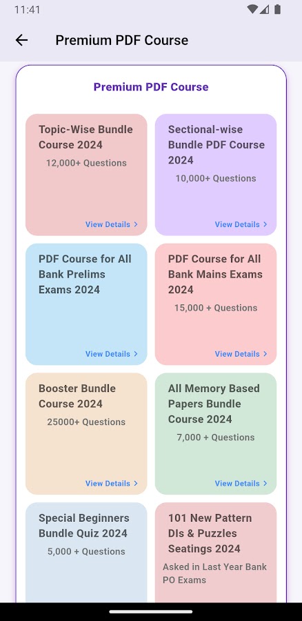 • Доступны пакеты пробных тестов для отдельных банковских экзаменов, таких как Canara Bank, IDBI Bank, South Indian Bank и др. Пакеты тестов основаны на формате соответствующих банковских экзаменов.