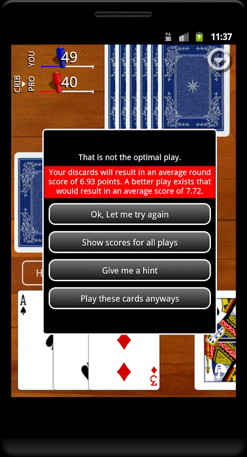 Cribbage Classic имеет ряд настроек, которые помогут вам узнать лучший ход для вашей ситуации и предложить помощь, если он заметит, что вы делаете неоптимальную игру. Или просто играйте в быстром режиме, где все подсчеты выполняются за вас, и вы можете просто сосредоточиться на сбросе и привязке. Настраивая настройки, вы можете перевести это приложение куда угодно: от ленивой, бездумной, пустой игры до оттачивающего мастерство обучающего курса, который поможет вам сокрушить вашего следующего противника. Статистика также сохраняется, так что вы можете видеть свой средний счет привязки, средний счет руки и средний счет криббиджа! Также показывает вам сводку всех неоптимальных ходов, которые вы сделали в конце игры, и отслеживает частоту ваших ошибок с течением времени, чтобы вы могли видеть, как вы улучшаете свои результаты.