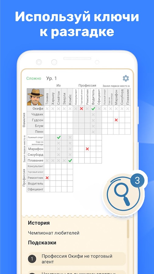 Встречайте Cross Logic – прекрасную разминку для ума, которая увлечет вас на целую вечность. И это еще не все! Логические пазлы – это целый тренажерный зал для мозга. Развивайте свой интеллект, совмещая приятное с полезным. Разгадывайте головоломки, решайте логические загадки и проходите уровни, чтобы выиграть игру.