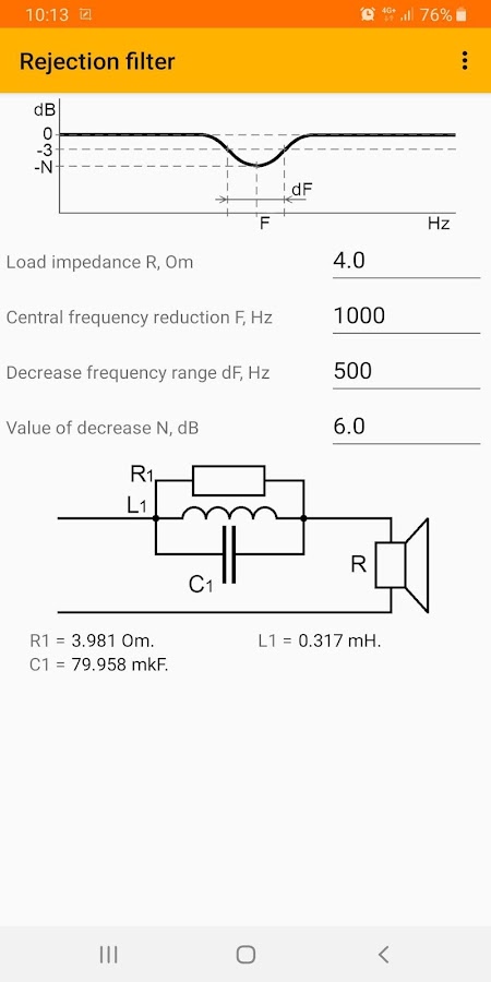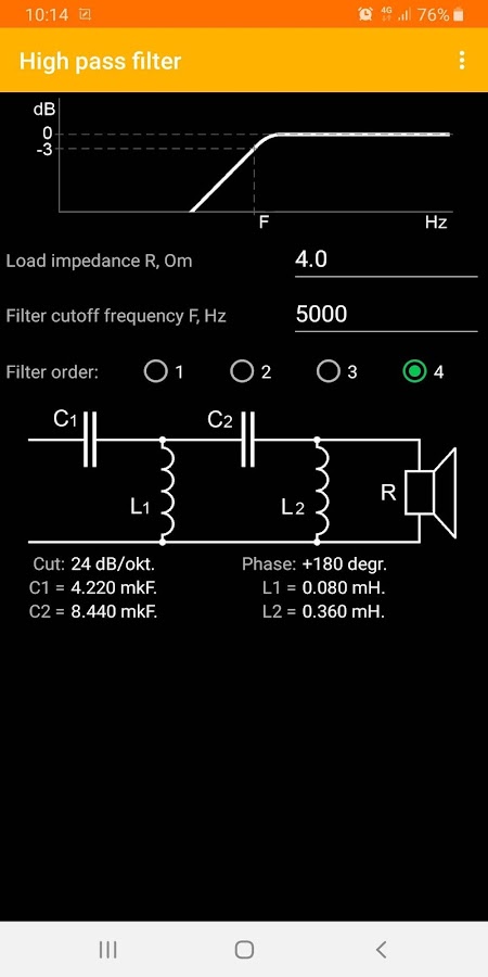 Кроссоверы для колонок представляют собой пассивные LC-фильтры звуковых частот. Приложение предназначено для расчета таких фильтров: фильтра низких частот, фильтра высоких частот, полосового фильтра, режекторного фильтра, а также корректоров амплитудно-частотной характеристики акустической системы. Предусмотрен расчет фильтров от первого до четвертого порядков.