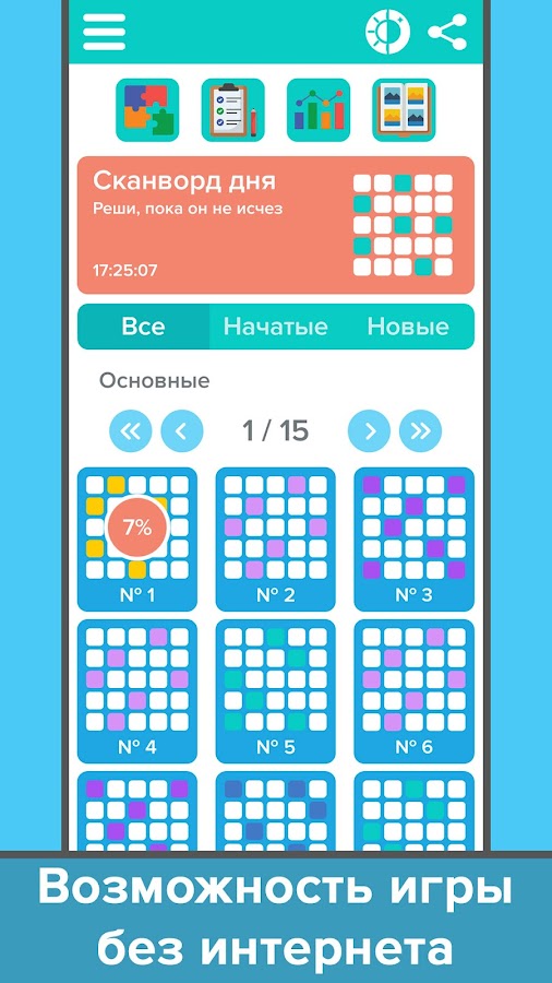 — разделы игры: основные, дополнительные и ежедневные сканворды;