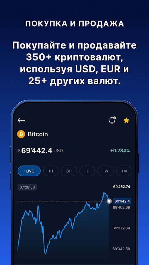 • Покупайте и продавайте популярные криптовалюты, включая Bitcoin и Ethereum, используя более 20 фиатных валют или кредитную/дебетовую карту.