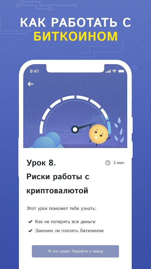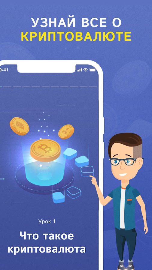 Наше приложение это полный курс обучения по работе с криптовалютой. Что такое биткоин, где хранить и как добывать крипту, на эти и множество других вопросов вы найдете ответ в нашем курсе.