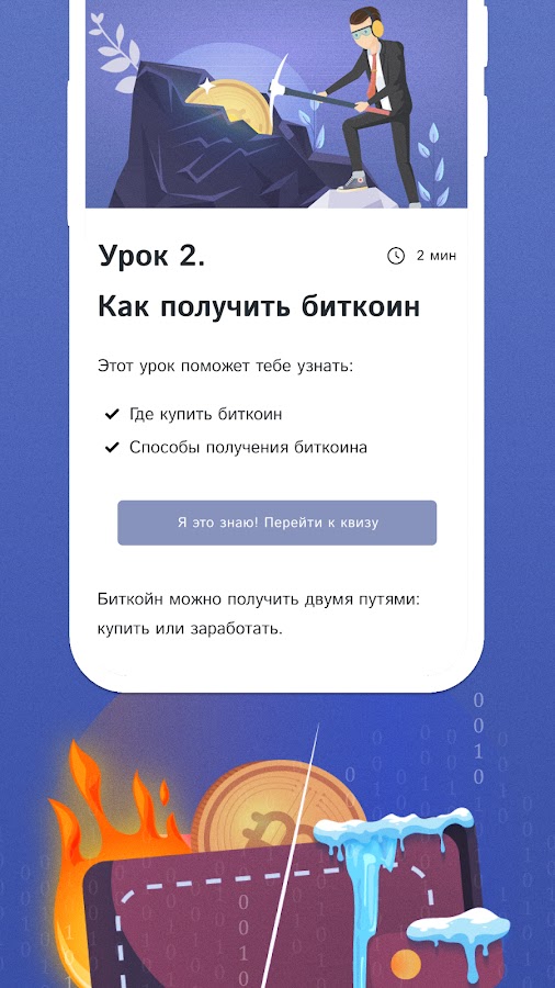 Какие есть способы получения криптовалюты и где ее хранить, это достаточно важный вопрос. В нашем приложении на изучение этих вопросов выделен отдельный блок курса. Мы подробно объясняем как можно получить биткоин или другую криптовалюту, а также где ее потом держать. После прохождения урока, вам нужно будет пройти тест, отвечая на вопросы, чтобы закрепить информацию из курса. Тестирование в нашем приложении есть после каждого пройденного урока. Таким образом не усвоить полученные знания просто невозможно.