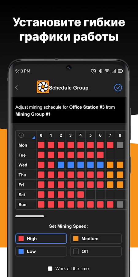 ✅ Используйте функцию расписания, чтобы настроить скорость майнинга для отдельных устройств или групп на определенные часы и дни для достижения лучших результатов. Контролируйте все, что происходит на вашей ферме удаленно. Например, включайте майнинг в назначенные рабочие часы или запланируйте работу в ваше отсутствие.
