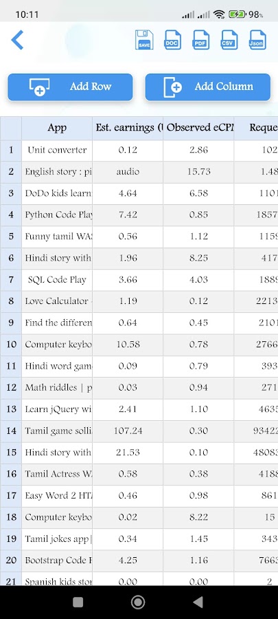 Это приложение используется для создания файла CSV самым простым способом, что означает простые инструменты для создания столбцов и строк, а затем просто нажмите на вновь созданную ячейку и введите свой собственный текст.