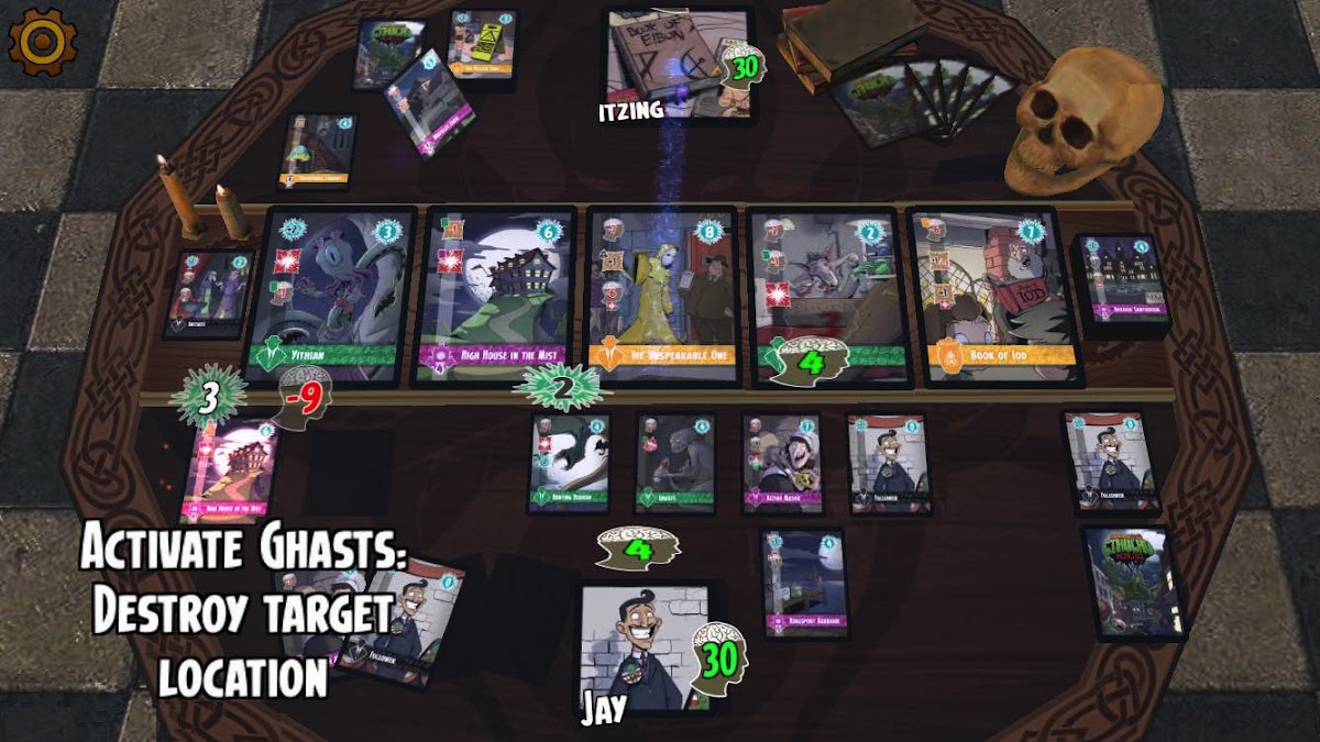 В Cthulhu Realms каждый игрок пытается свести своего противника с ума или иметь больше здравомыслия, чем у его противников, когда колода заканчивается.