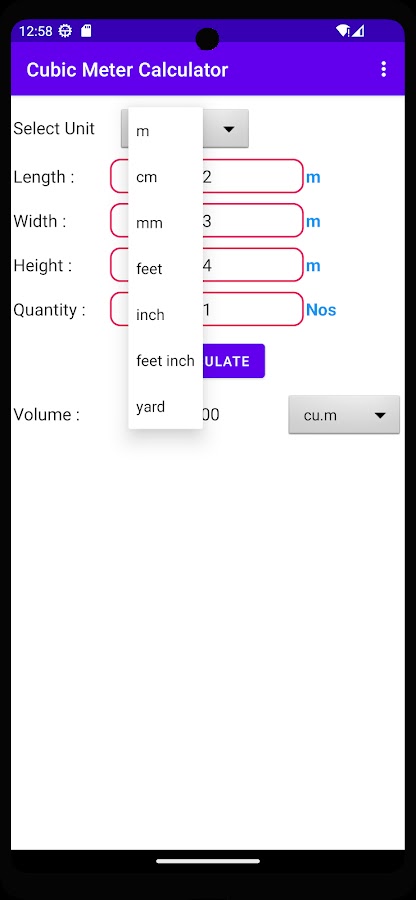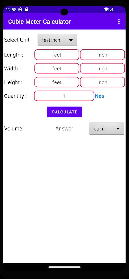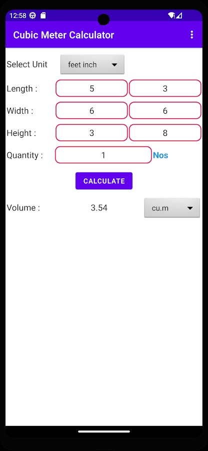 Это приложение используется для расчета объема кубических метров для заданной длины, ширины и высоты. Вы можете ввести длину, ширину и высоту в различных единицах измерения, таких как метры, футы, дюймы, мм, см, ярд и т. д. Ответ вы получите в кубических метрах, кубических футах, кубических ярдах и т. д.