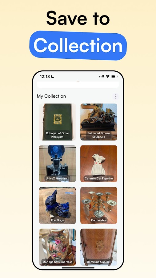 Сохраняйте все ваши идентифицированные антикварные предметы в прекрасно оформленной коллекции. Организуйте свои сокровища и возвращайтесь к их истории в любое время, будь то винтажные украшения, редкие предметы коллекционирования или находки с семейных распродаж.