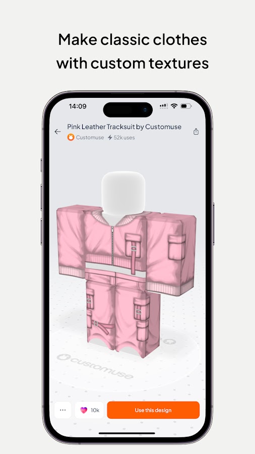 Присоединяйтесь к растущему сообществу, насчитывающему более 2 миллионов дизайнеров и авторов, с помощью Customuse, идеального инструмента для 3D-дизайна. Создавайте уникальные скины Roblox, создавайте одежду Zepeto, создавайте аватары Minecraft, настраивайте фильтры для TikTok/Snapchat/Instagram и многое другое.