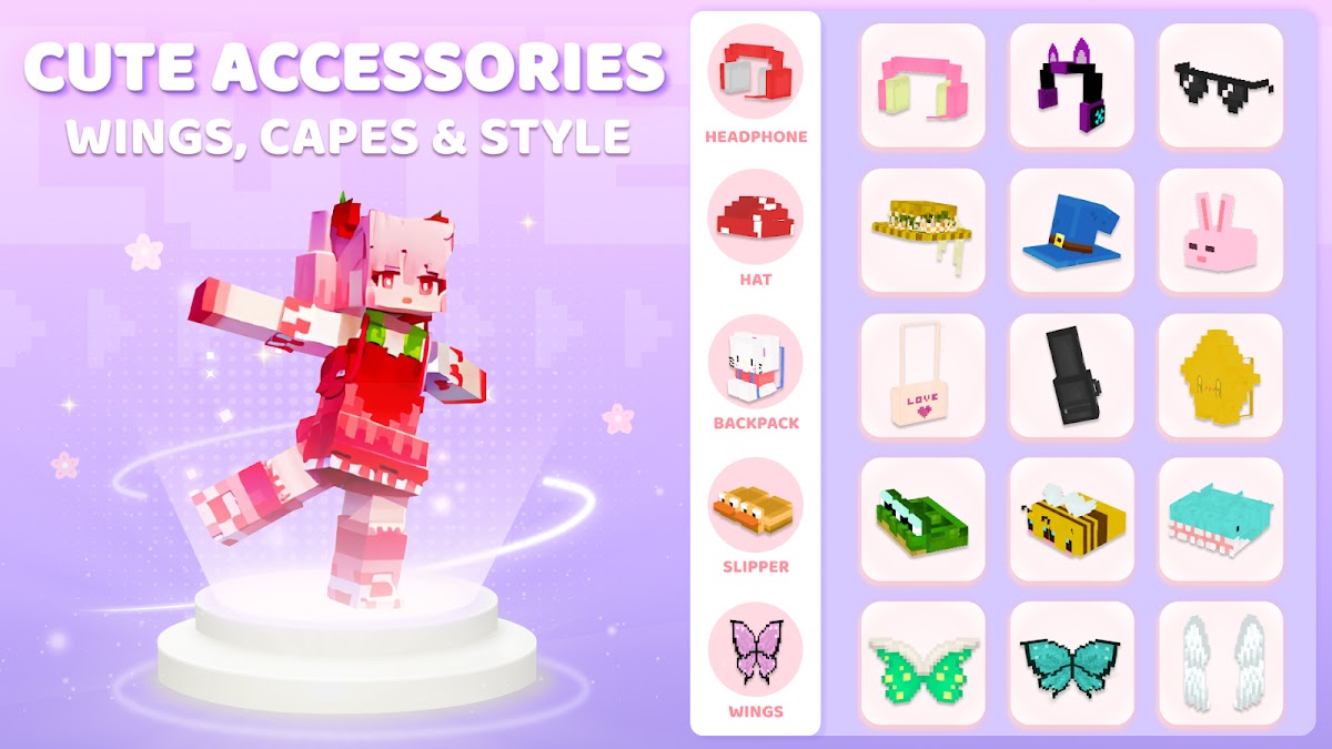 Дополните свой образ заячьими тапочками, цветочными венками, крыльями феи, стильными очками, шляпами и рюкзаками! Идеальный способ выразить свой кавайный стиль в Minecraft.