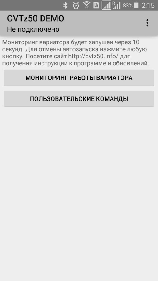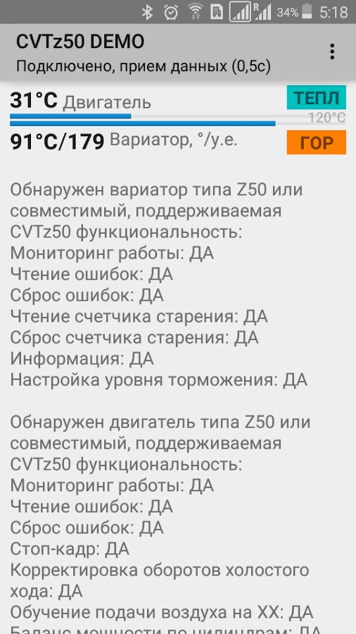 В случае успешного подключения к электронным блокам управления CVTz50 DEMO покажет температуру двигателя и вариатора, а также список функциональных возможностей, поддерживаемых полной версией CVTz50 для конкретного автомобиля.