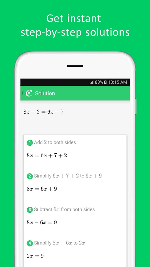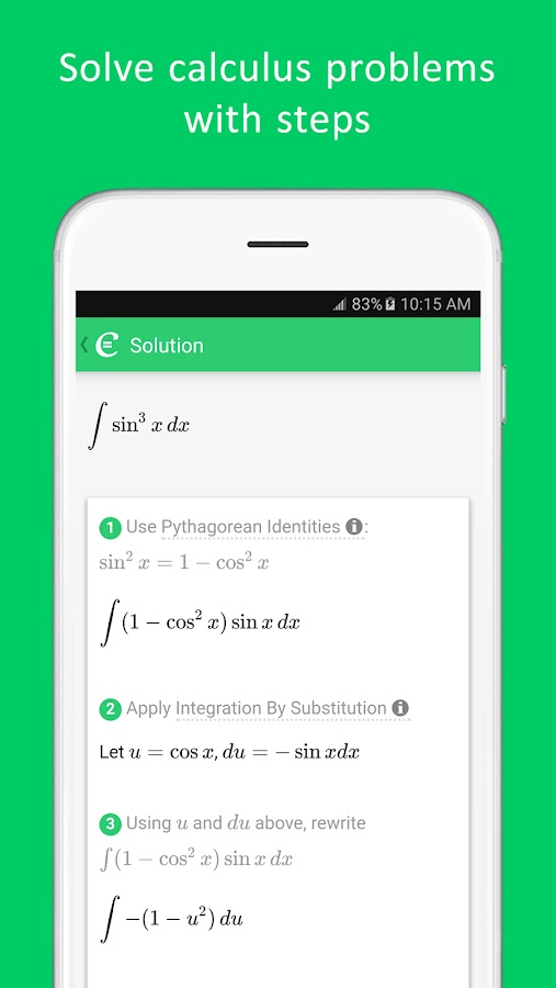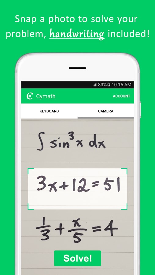 С миллионами пользователей по всему миру Cymath.com, математике решатель приложение Cymath использует ту же математику двигатель, что позволяет решать проблемы на ходу! Просто введите проблему с вашей математике домашнее задание, и пусть Cymath решить для вас шаг за шагом! Мы предлагаем алгебру, а также исчисление помощи.
