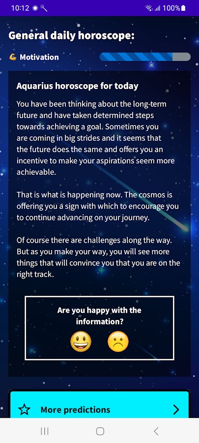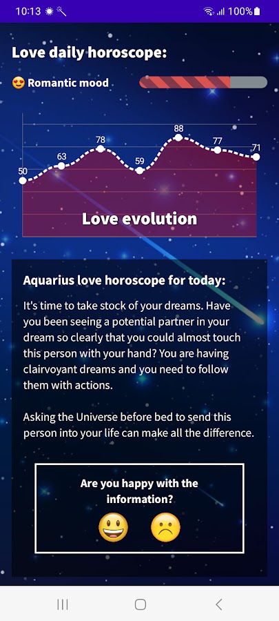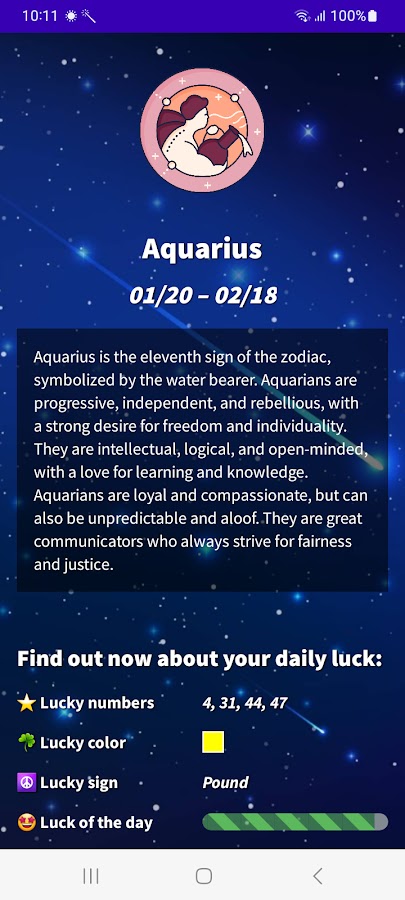 Узнайте, каким будет ваш день, с нашим ежедневным гороскопом Водолея на 2026 год! Загрузите наше бесплатное приложение из Google Play и получите доступ ко всей астрологической информации, необходимой для планирования дня заранее. С нашим приложением вы узнаете свое счастливое число, счастливый цвет, счастливый знак, эволюцию своего состояния, ежедневную мотивацию, романтическое и финансовое настроение. Не ждите больше! Загрузите наше бесплатное приложение гороскопа Водолея и начните пользоваться всеми его преимуществами.