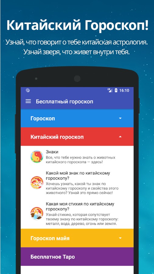 2. Китайский Гороскоп — Следует астрологии китайского календаря. Он делится на 12 лунных циклов, которые представляют 12 животных, определяющих энергию людей, родившихся в их год. 12 животных – это Крыса, Бык, Тигр, Кролик, Дракон, Змея, Лошадь, Коза, Обезьяна, Петух и Свинья. К тому же, каждое животное связано со стихией, как Металл, Вода, Дерево, Огонь и Земля, что тоже влияет личностные особенности. Хочешь узнать свой знак по китайскому гороскопу? Скачай приложение и посмотри!