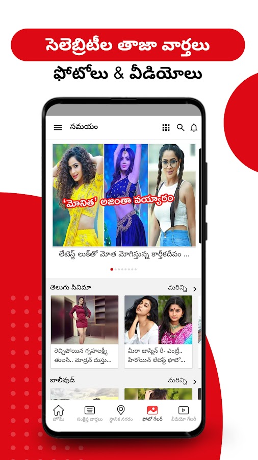 • Последние новости на телугу о популярных знаменитостях, таких как Mega Star Chiranjeevi, Nagarjuna, Anushka Shetty, Kajal Aggarwal, Bala Krishna, Tamannaah, Pawan Kalyan, Mahesh Babu, Sneha, Jr. NTR и других.