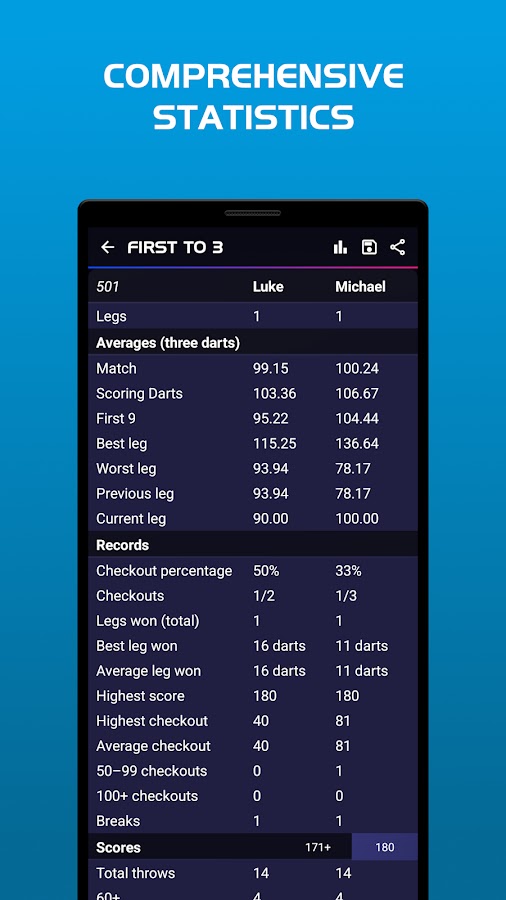 * Различные средние значения, например среднее значение по матчу, среднее значение лучшего сета и/или лега, среднее значение первых девяти дротиков в леге.