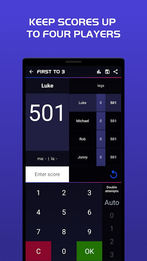 Darts Scoreboard — идеальное приложение для отслеживания результатов в дартс во время игры «501» или одного из ее вариантов. В этом приложении для бомбардиров вы можете установить множество предпочтений, таких как количество игроков, стартовый счет или хотите ли вы играть легами или сетами. Пользоваться приложением легко: после каждого хода вам просто нужно ввести общее количество очков, набранных тремя дротиками. Табло дартс выполняет математические расчеты и предоставляет вам широкий спектр статистических данных. Эту статистику можно сохранять и делиться ею. Когда вы наберете счет, который можно завершить, приложение покажет предложение оформить заказ.