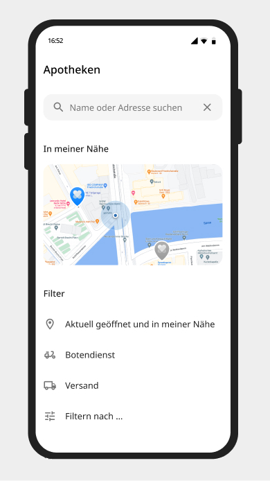Простое погашение рецепта: вы можете легко отправить свои электронные рецепты в нужную аптеку с помощью приложения. Ваши лекарства будут зарезервированы для вас и доставлены курьером. Конечно, вы также можете получать рецепты непосредственно в аптеке. В приложение включены все аптеки вашего региона, а также интернет-аптеки.