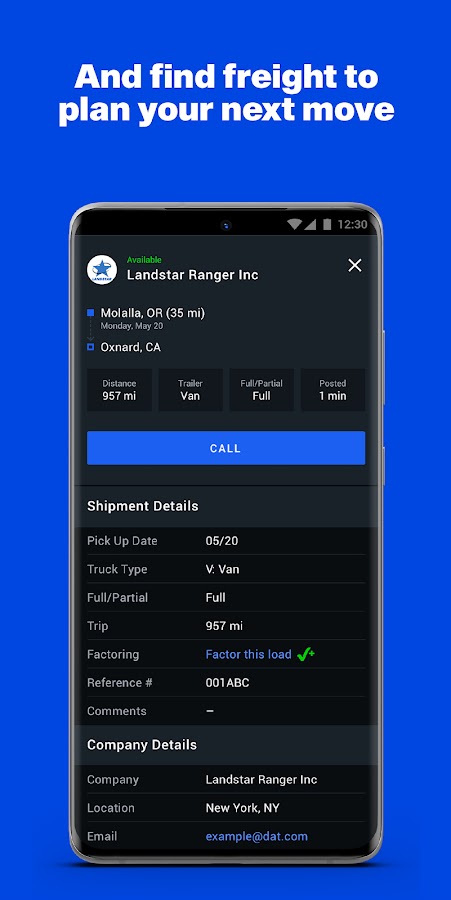 Помимо поиска грузов и удобств для грузовиков, у вас будет доступ к самым точным данным о рыночных курсах, инструментам и информации для прогнозирования и ведения переговоров с позиции силы. Получите нужный груз по нужной цене с помощью приложения DAT One для дальнобойщиков.