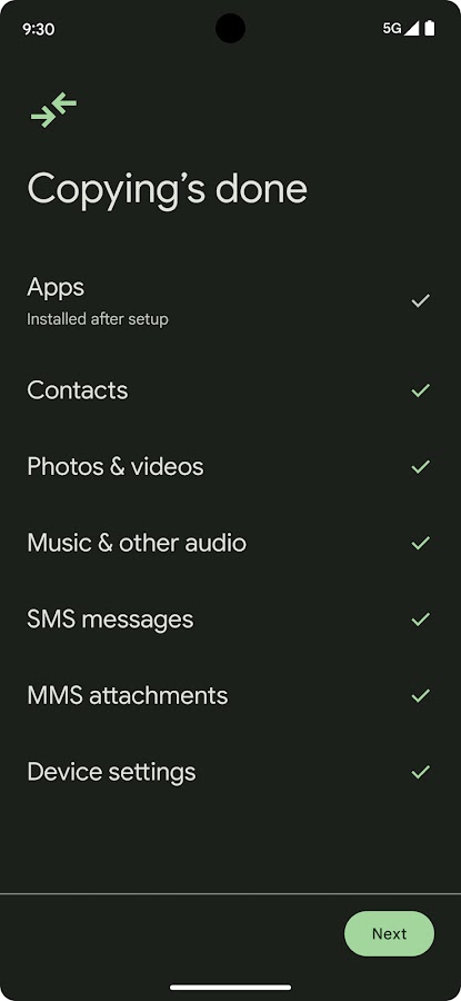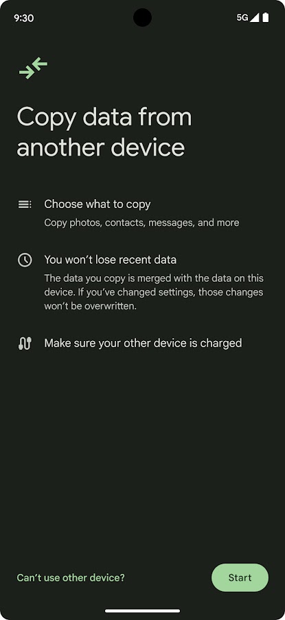 Если у вас Pixel 9 или более новая модель (например, Pixel 9 Pro, Pixel 9 Pro Fold или Pixel 9 серии A), вы можете использовать Android Switch для переноса данных в любое время после настройки, даже если у вас нет другого устройства.