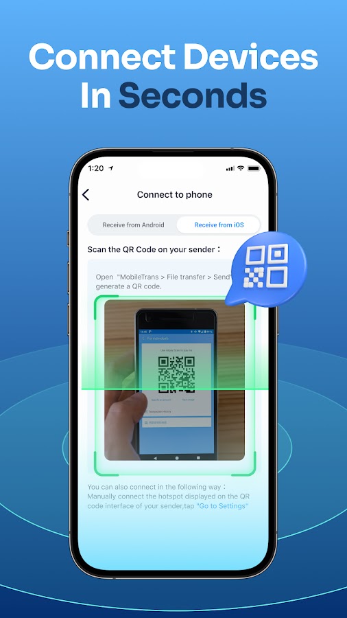 ✔ Сканирование QR-кодов для подключения между различными устройствами: это простое приложение для передачи файлов подключается с помощью QR-кода для переноса контента. Вы можете безопасно и быстро переносить свои данные между устройствами без потери качества контента.