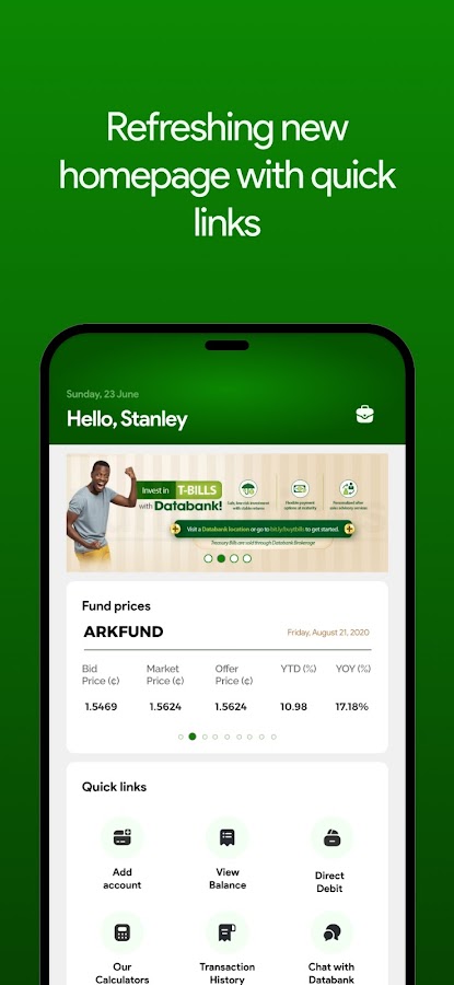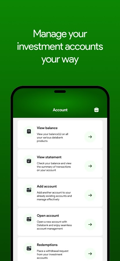 Получите полный контроль с приложением Databank Mobile. Управляйте своими инвестициями и беспрепятственно выполняйте транзакции. Находитесь ли вы дома, в офисе или в дороге, наслаждайтесь нашими инвестиционными услугами, не выходя из собственного телефона, безопасно и надежно.